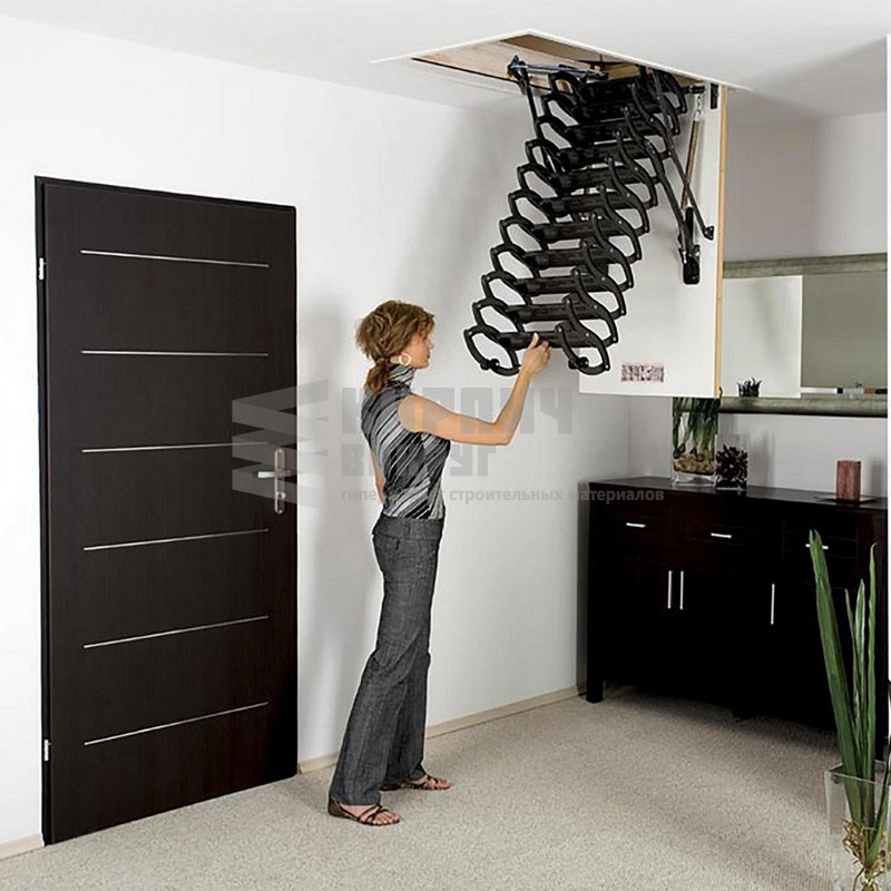Металлическая чердачная лестница LST оснащена энергосберегающей термоизоляционной крышкой люка (толщина крышки с утеплителем – 36 мм) белого цвета. По периметру люка установлен контур уплотнения, обеспечивающий высокую степень герметичности. Благодаря «ножничной» системе складывания в сложенном виде лестница очень компактна и имеет небольшой размер крышки люка. S-образные боковые элементы лестницы выполняют роль поручней и придают лестнице современный вид. Рекомендуемая высота установки 260-280 см.
